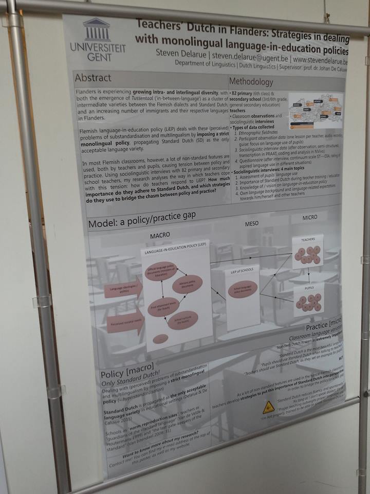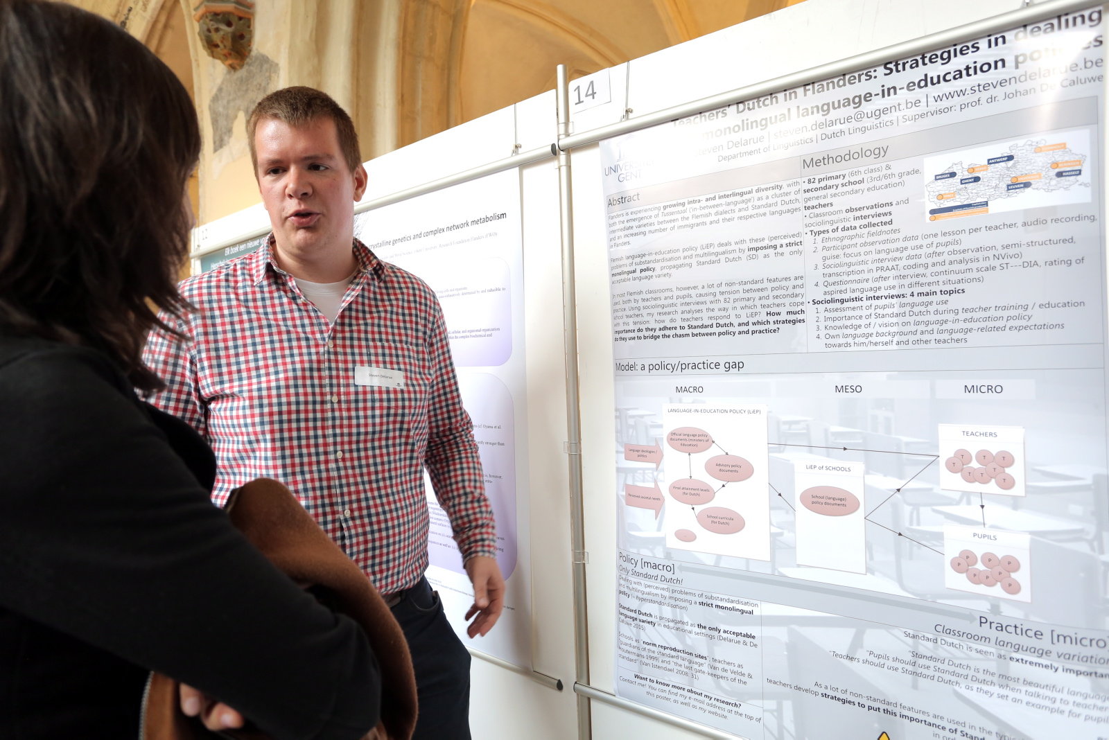 Vandaag vond de vierde editie plaats van het doctorandicolloquium van de Faculteit Letteren en Wijsbegeerte (UGent), na een ‘winterslaap’ van negen jaar. Bijna 50 doctorandi van de faculteit presenteerden er aan de hand van een poster hun onderzoek, niet alleen aan collega’s van de faculteit maar ook aan het ruimere geïnteresseerde publiek. Het colloquium werd dit keer opgehangen aan het actuele thema Open humanities: hoe moeten we binnen de humane wetenschappen omgaan met de lokroep van “open science”? En hoe zit dat precies met “open access”-artikels? Collega Bart Verschaffel wijdde er een keynotelezing aan, en in de namiddag werd het onderwerp ook uitgebreid besproken in een panelgesprek. Dankzij enkele ijverige Twittergebruikers – we zijn méé in onze faculteit, mocht u daar nog aan twijfelen! – kunt u via de hashtag #flwdoc15 de highlights herbeleven. Zelf presenteerde ik ook een poster, met de ronkende titel Teachers’ Dutch in Flanders: strategies in dealing with monolingual languages in education policies.