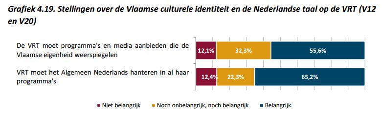 Op die stelling antwoordt 65,2% van de ondervraagden “ja” (som van ‘eerder belangrijk’ en ‘heel belangrijk’). Ik kan me voorstellen dat sommigen dat best een hoge score vinden, en de stijging ten opzichte van 2010 is opvallend: toen was 52,8% het nog met de stelling eens. Tegelijk had ik verwacht dat de score nog hoger zou liggen: intussen weten we dat de modale Vlaming een hoge symbolische waarde toedicht aan het Standaardnederlands, en dan is het ook logisch dat daar voor de openbare omroep bepaalde verwachtingen aan gekoppeld worden. Het woord symbolische in de vorige zin is echter van belang: intussen weten we uit allerlei studies – waaronder ook mijn eigen onderzoek, tot op zekere hoogte – dat er een diepe kloof gaapt tussen het gepercipieerde belang van Algemeen Nederlands en de eigenlijke taalpraktijk.